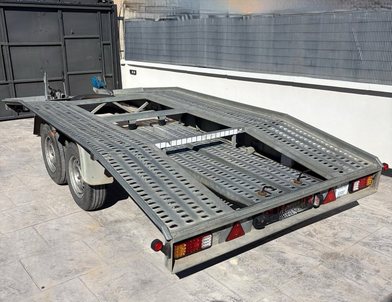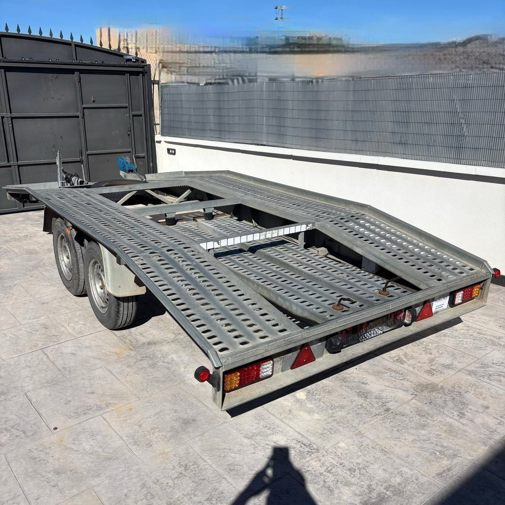 Remolque portacoches de MMA 2.700kg. Tara de 600kg y carga de hasta 2.100kg. Plataforma de 4 metros de largo y 2 de ancho.