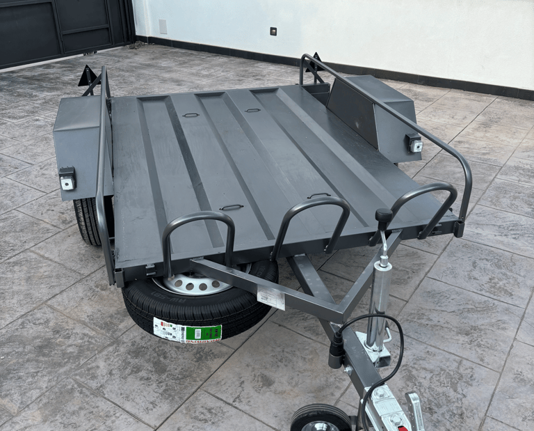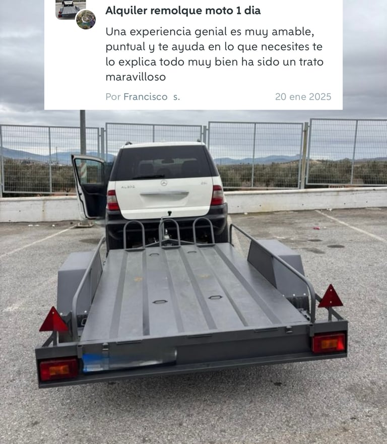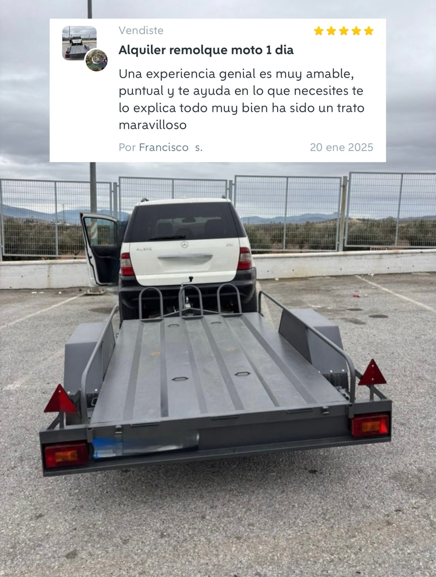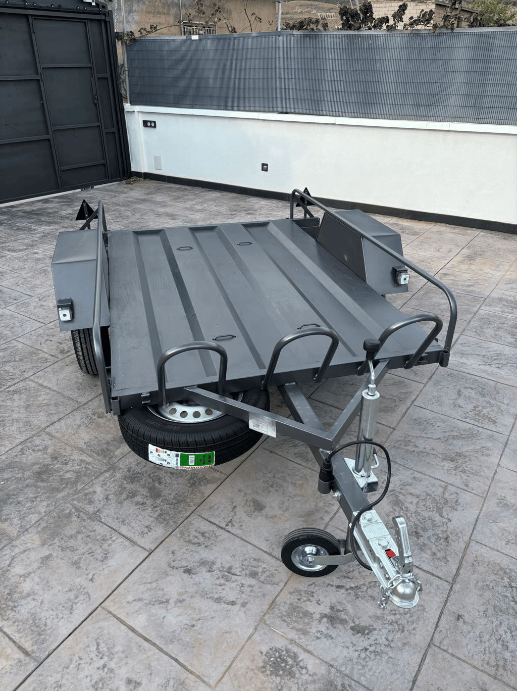 Remolque de hasta 3 motos estable y ancho. Con rueda de repuesto y rampa.